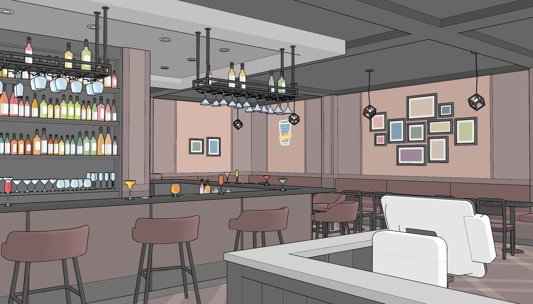 내용물의 색상을 바꾸기 쉬우며, 비어있는 잔은 뒷편 진열장과 천장에 달린 잔 거치대에 구비되어있습니다.