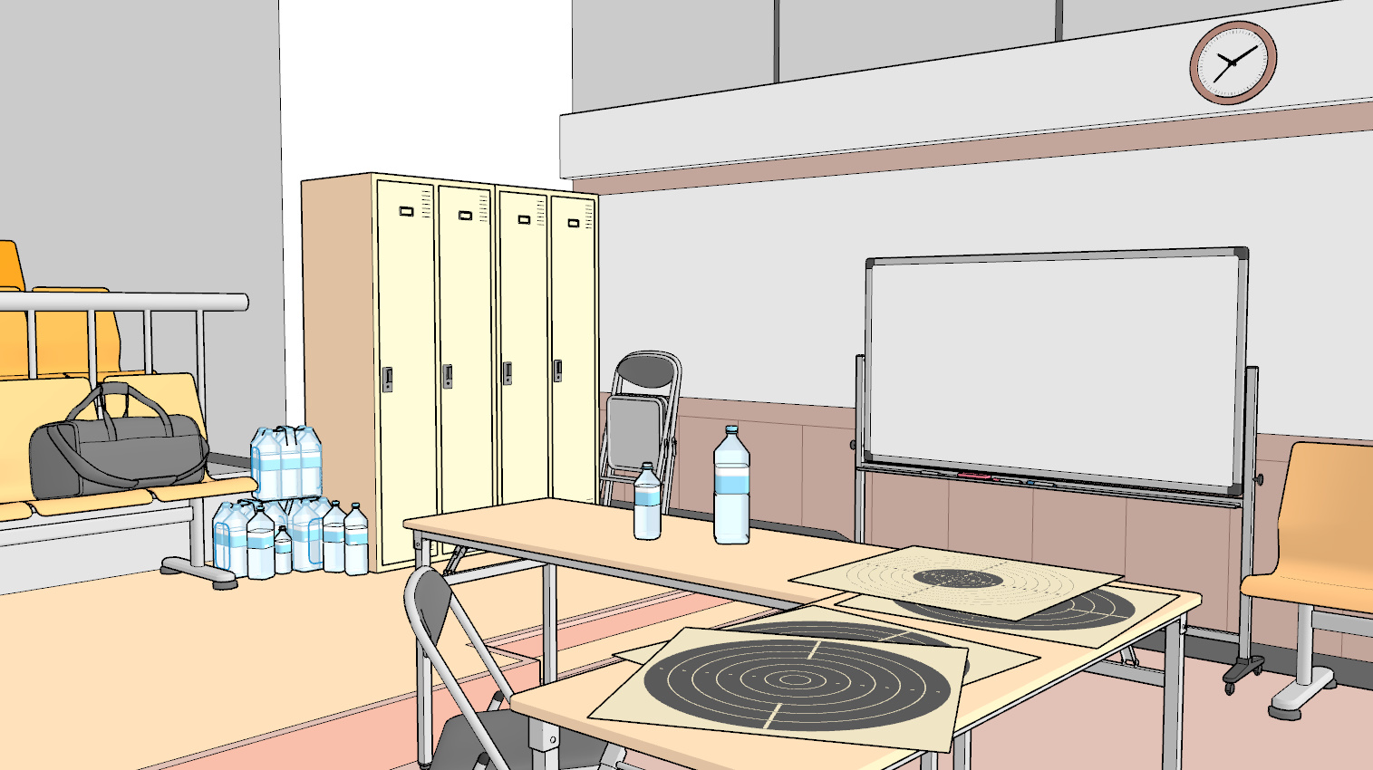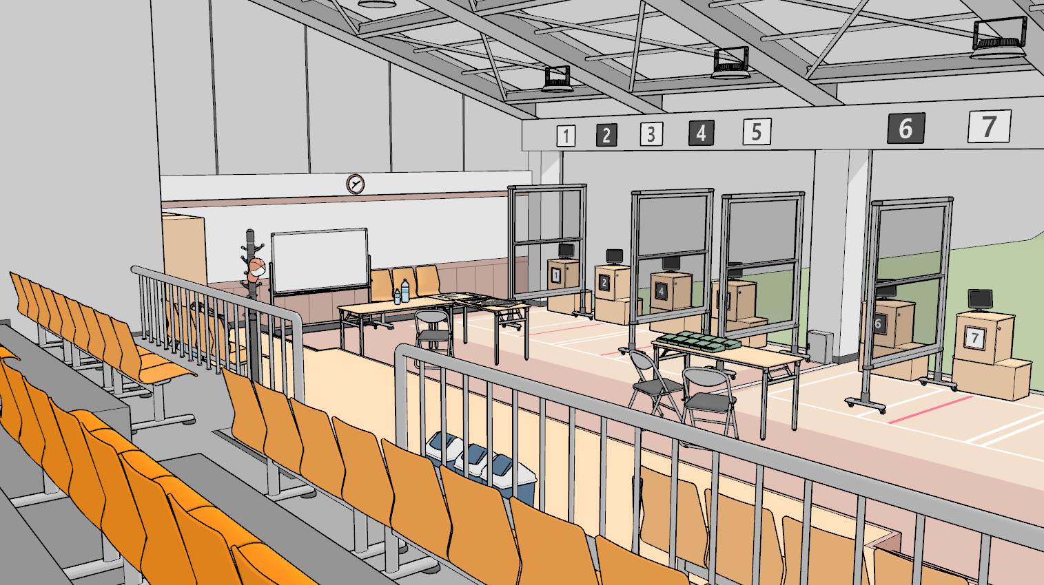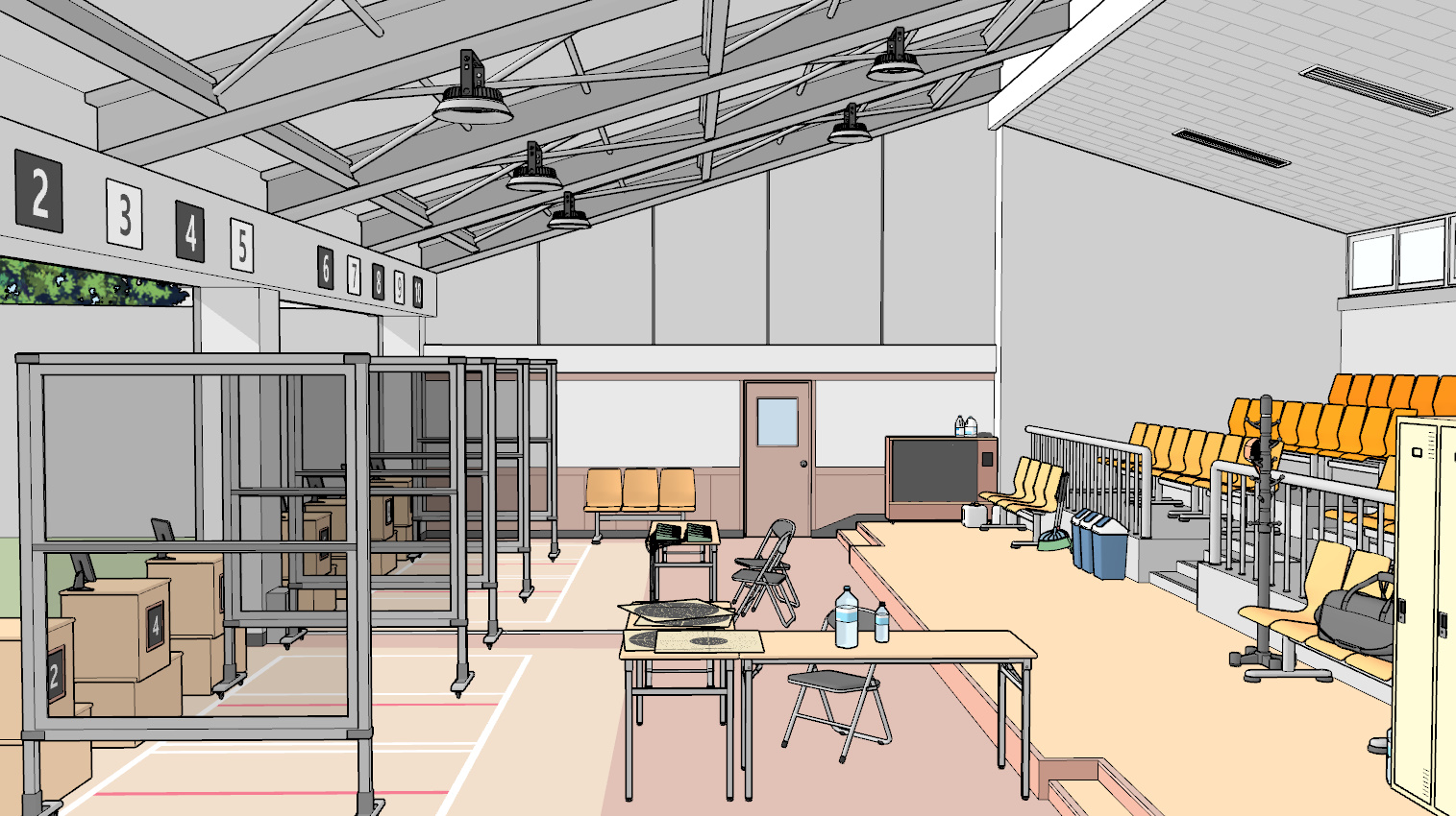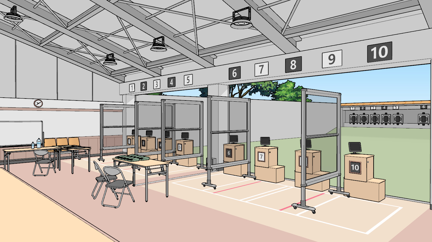 사로 앞의 테이블이나 테이블, 표적 위 등 곳곳에 붙은 번호판 같은 요소는 창원 국제사격장을 참고했습니다.