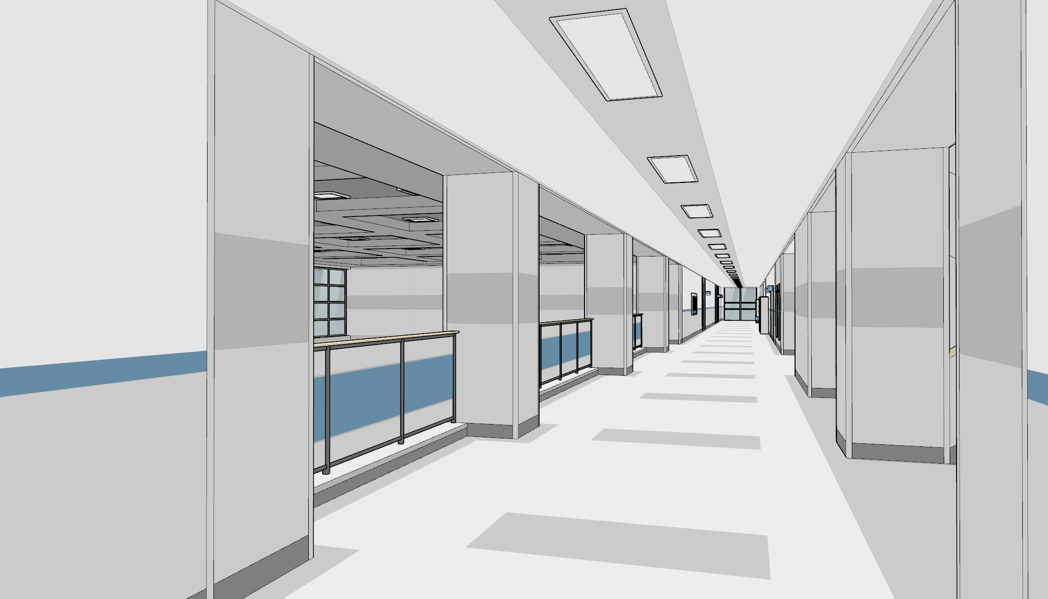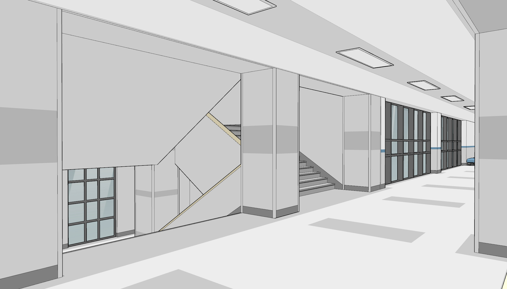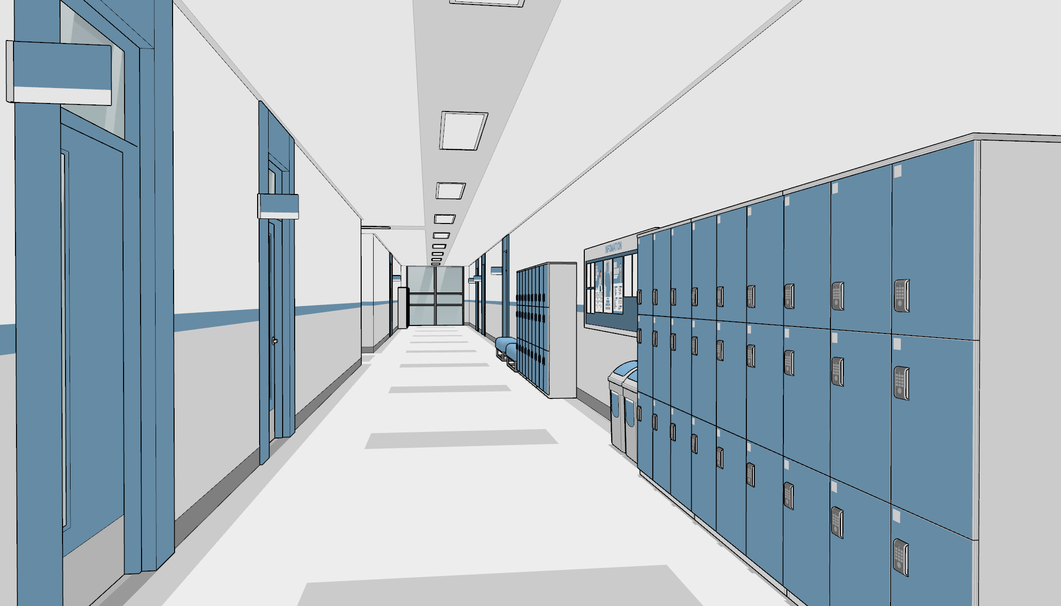 복도에는 게시판과 캐비닛, 벤치와 쓰레기통들이 곳곳에 배치되어 있습니다.