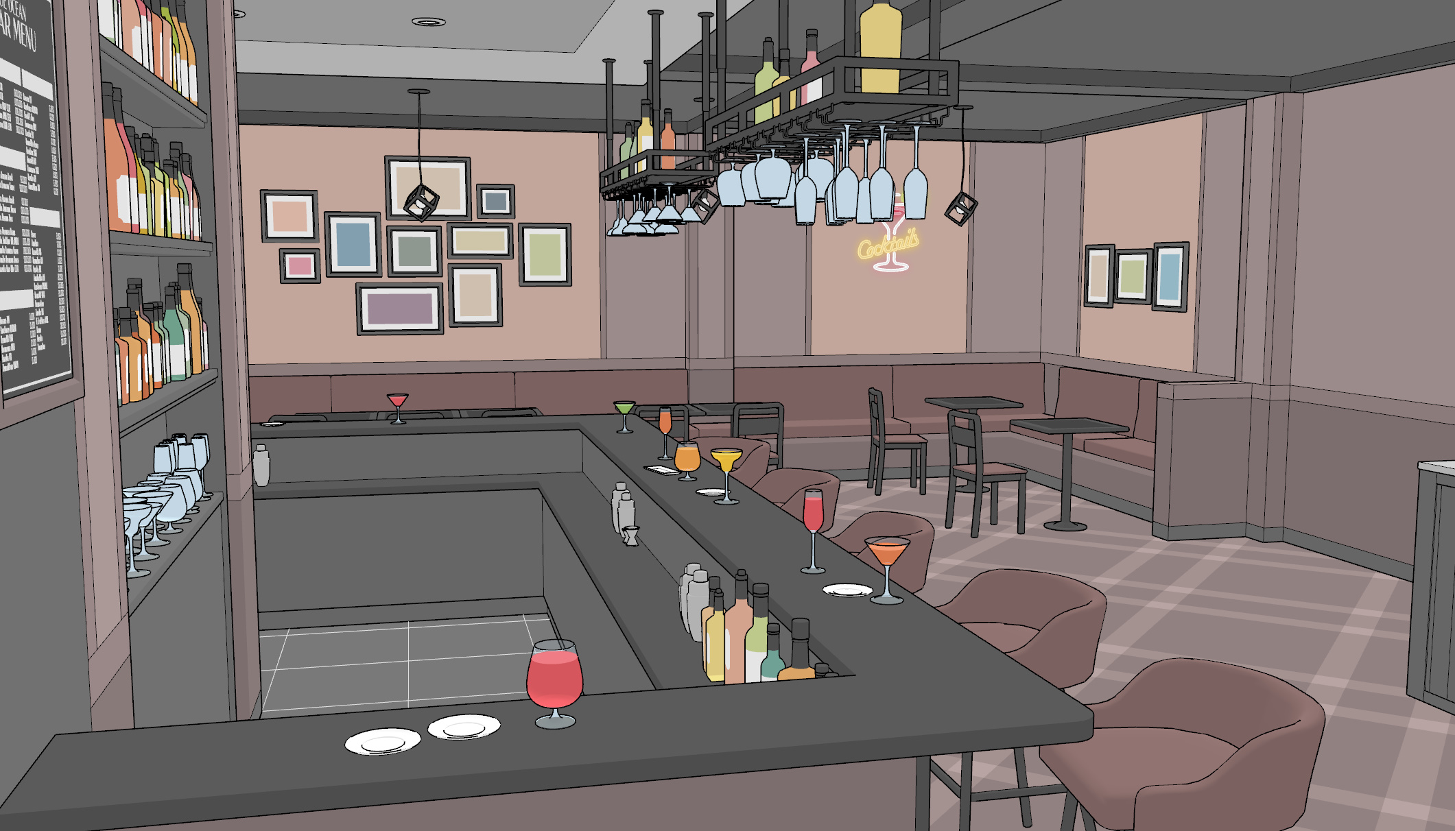 내용물의 색상을 바꾸기 쉬우며, 비어있는 잔은 뒷편 진열장과 천장에 달린 잔 거치대에 구비되어있습니다.