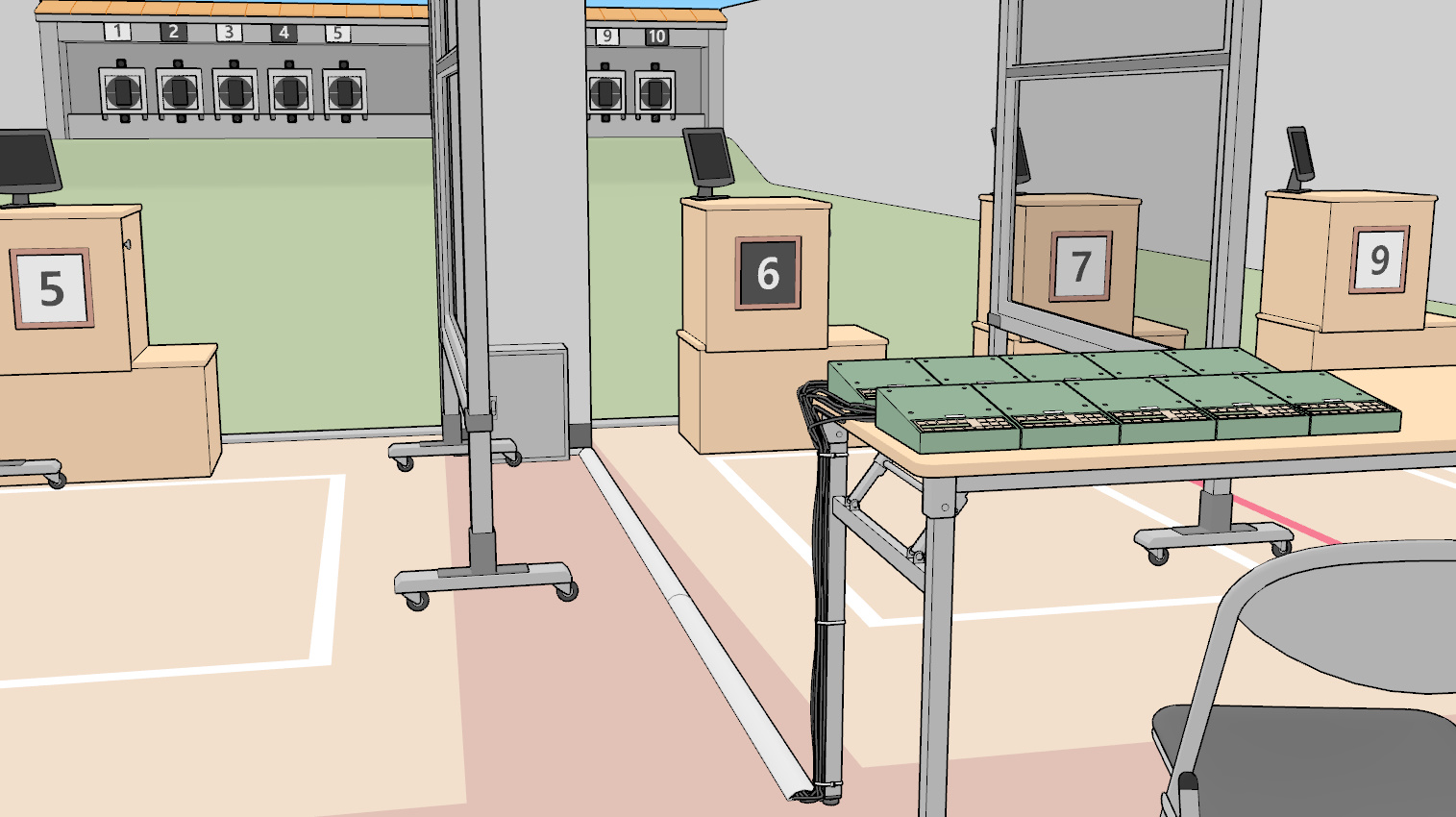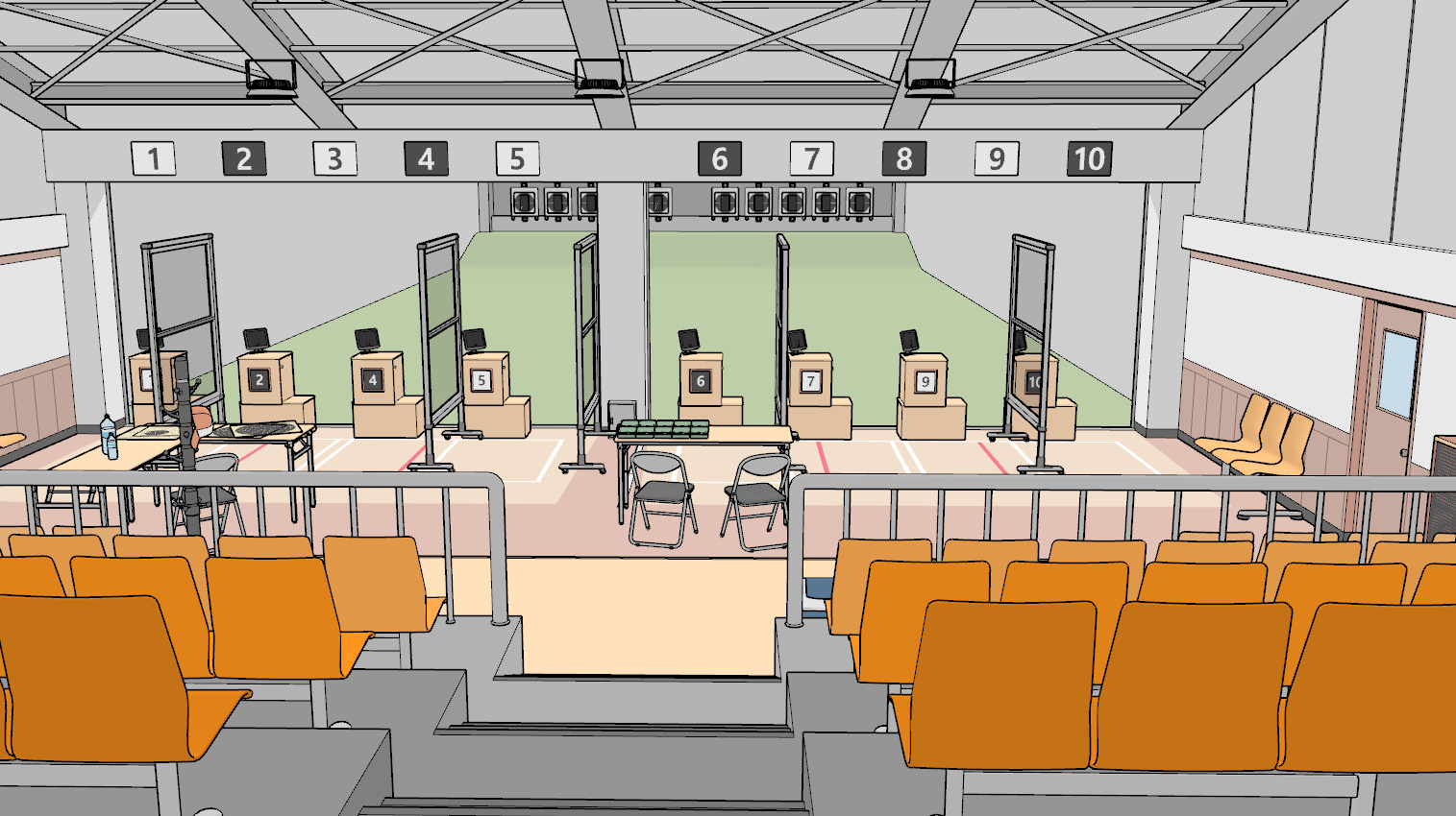 사로 앞의 테이블이나 테이블, 표적 위 등 곳곳에 붙은 번호판 같은 요소는 창원 국제사격장을 참고했습니다.