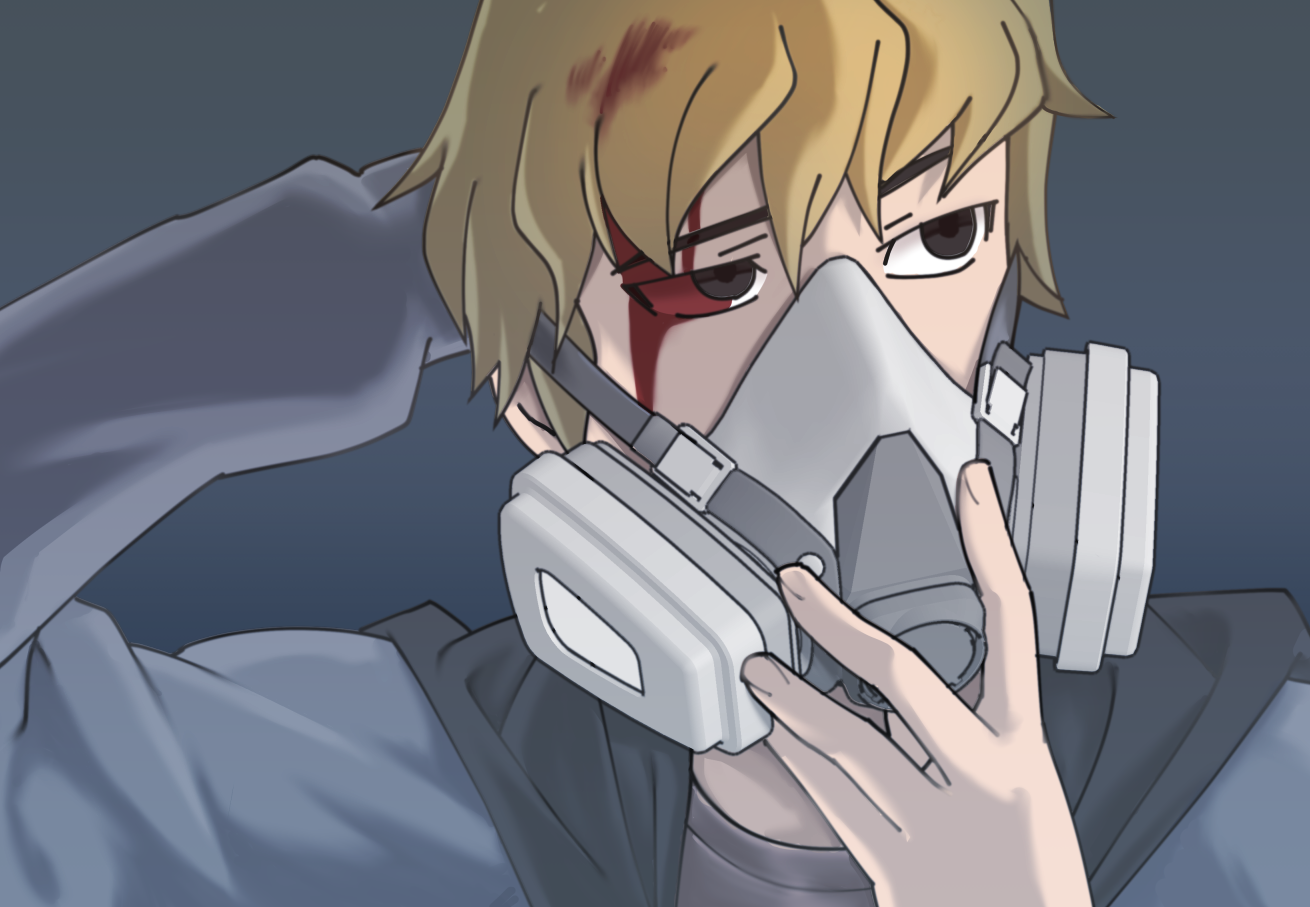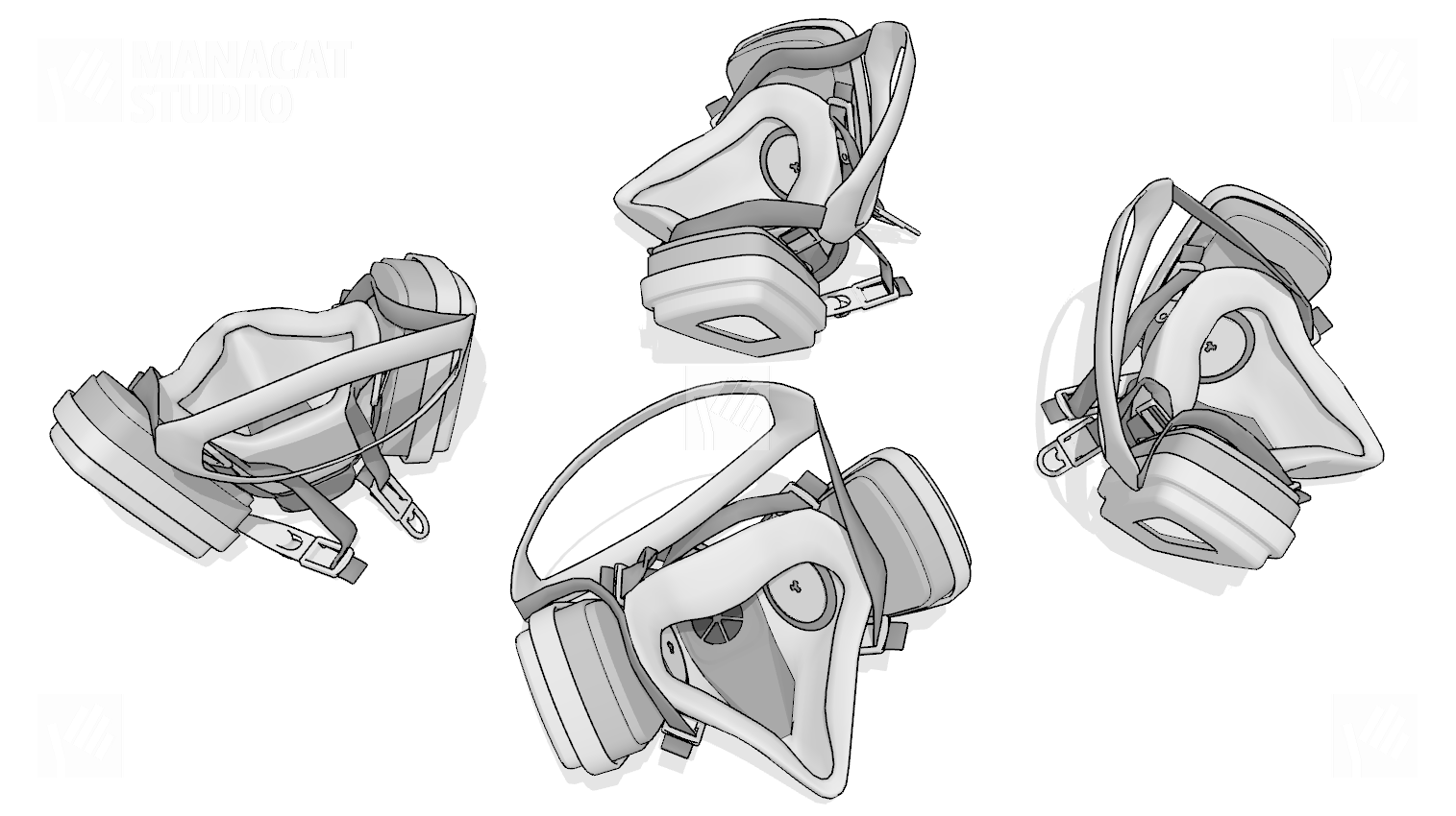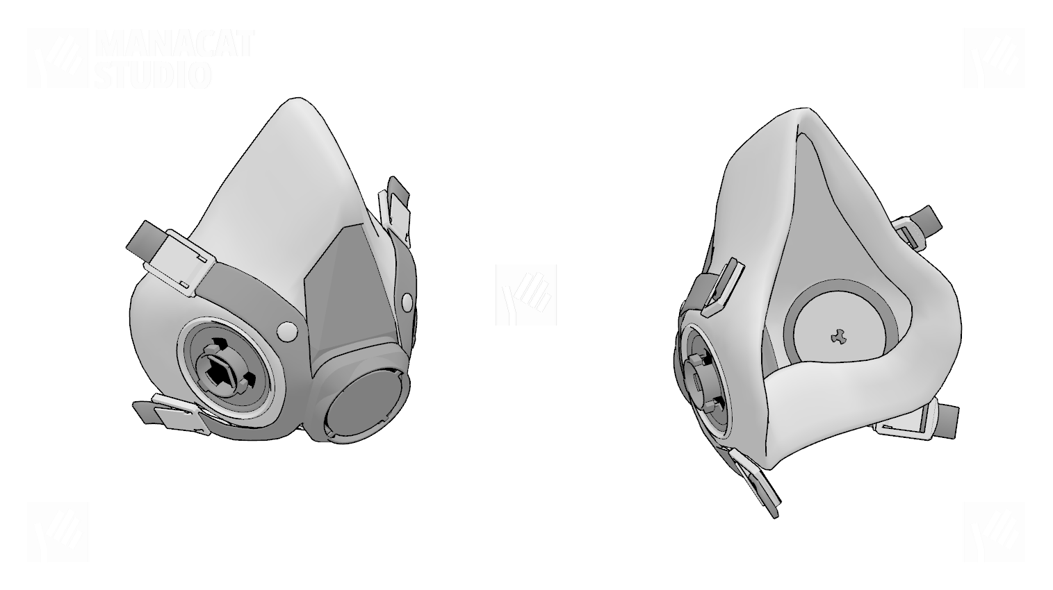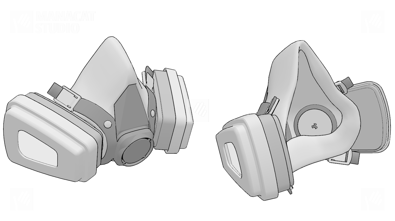 얼굴에 쓰고 좌우에 필터를 장착하여 호흡기를 보호하는 마스크입니다.