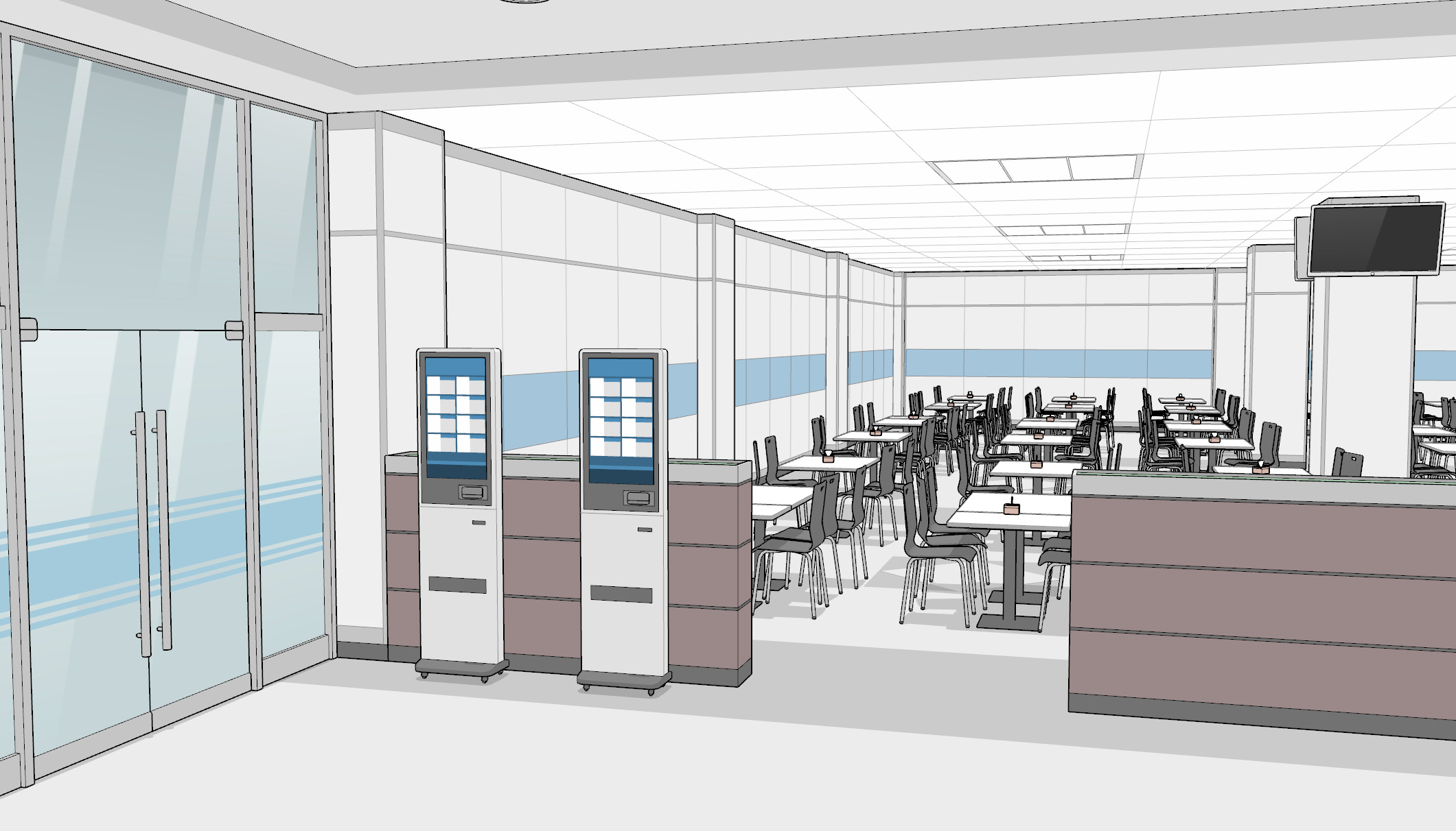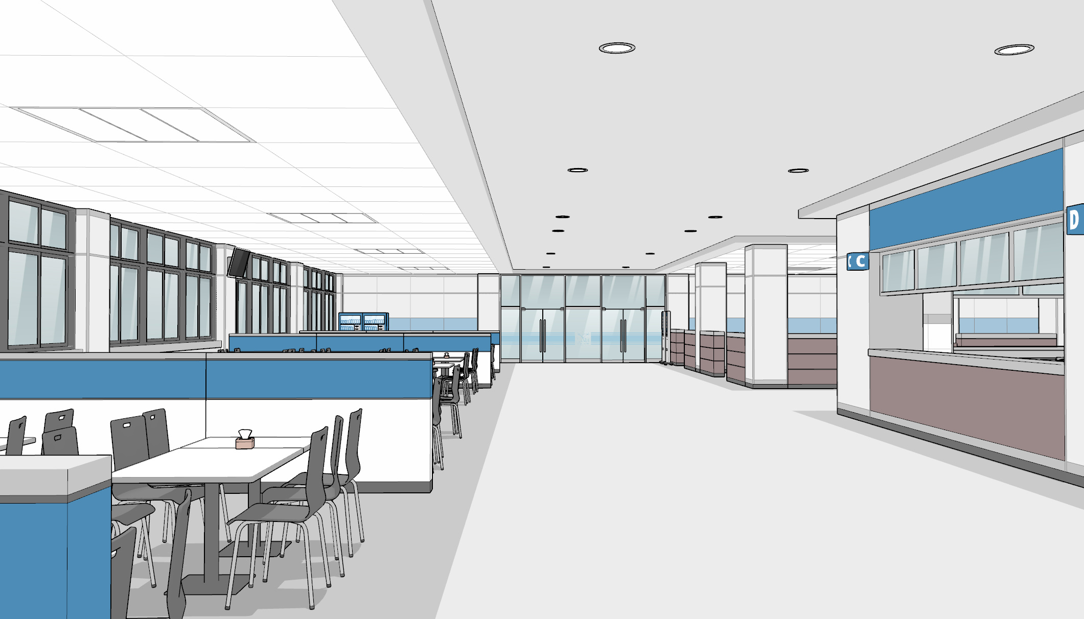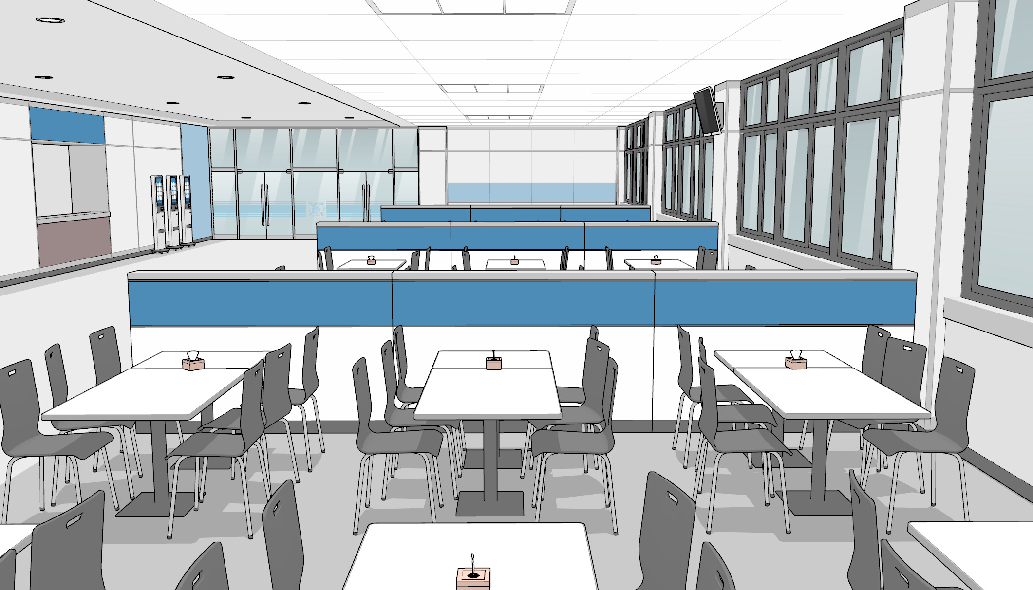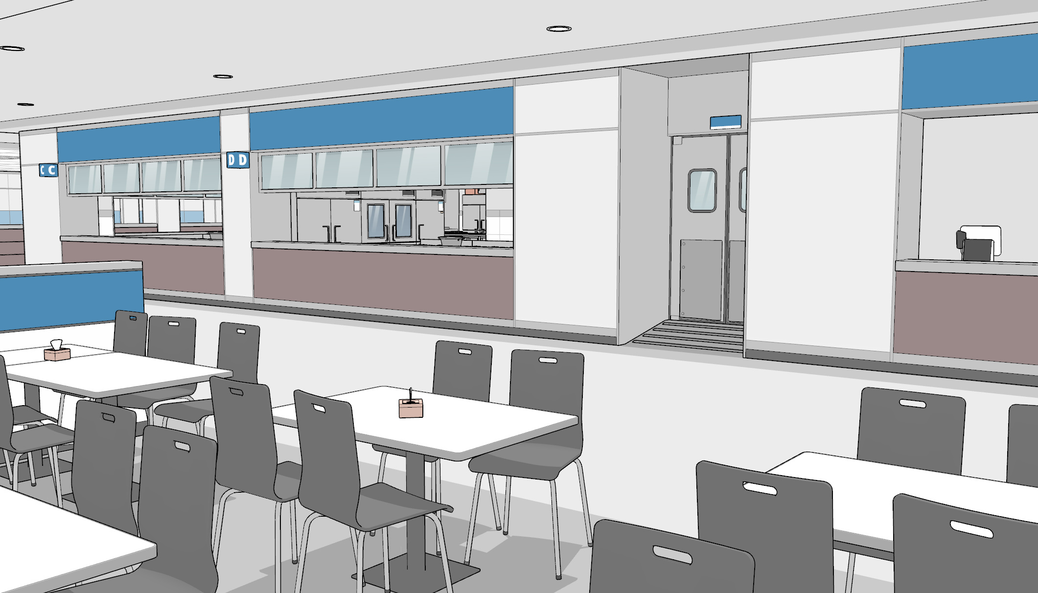 대학 학생식당을 기반으로 작업되긴 하였으나, 출입구쪽 유리창에 그려진 학교 로고만 바꿔주면 회사 구내식당으로 활용해도 손색이 없습니다.