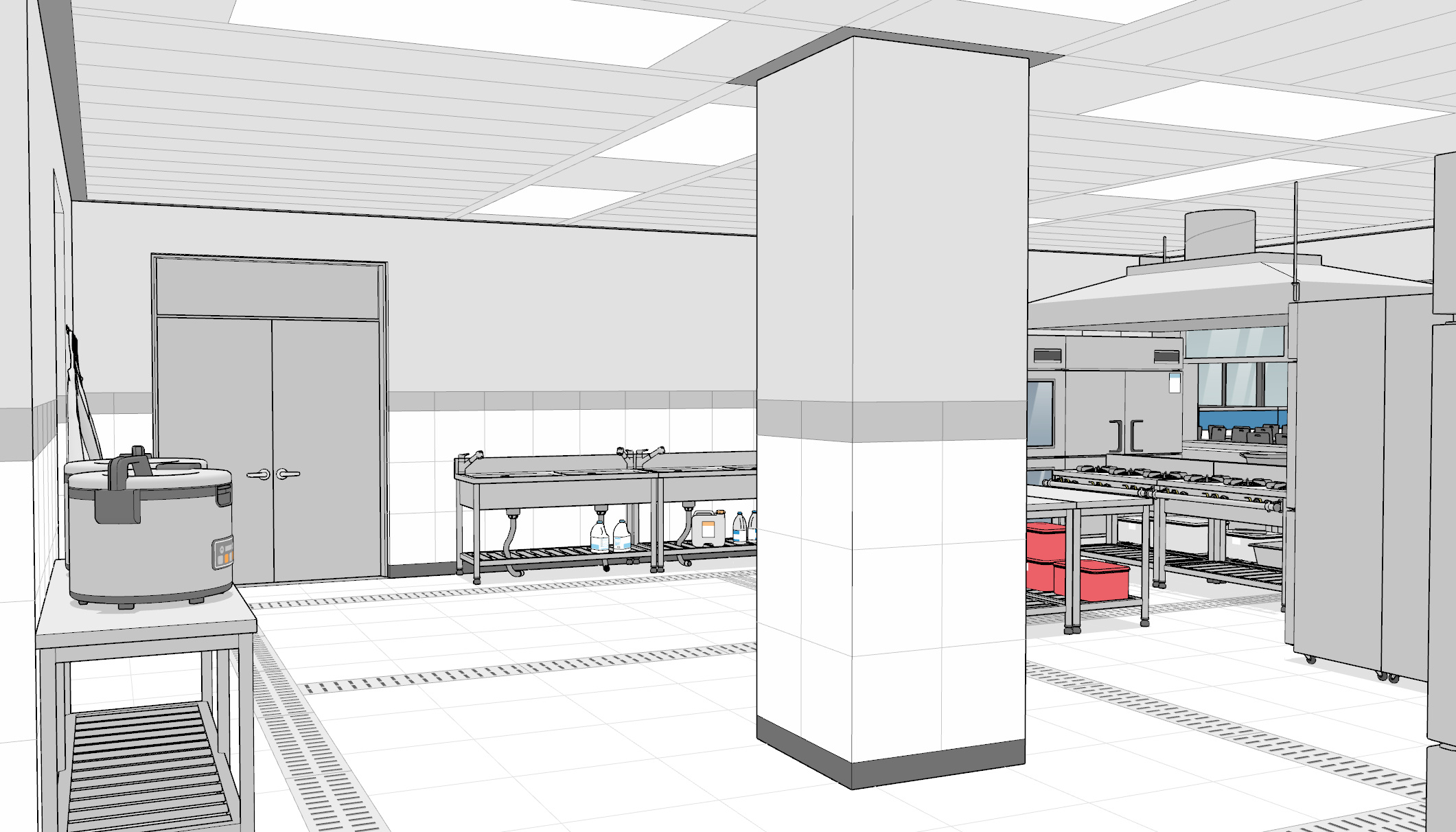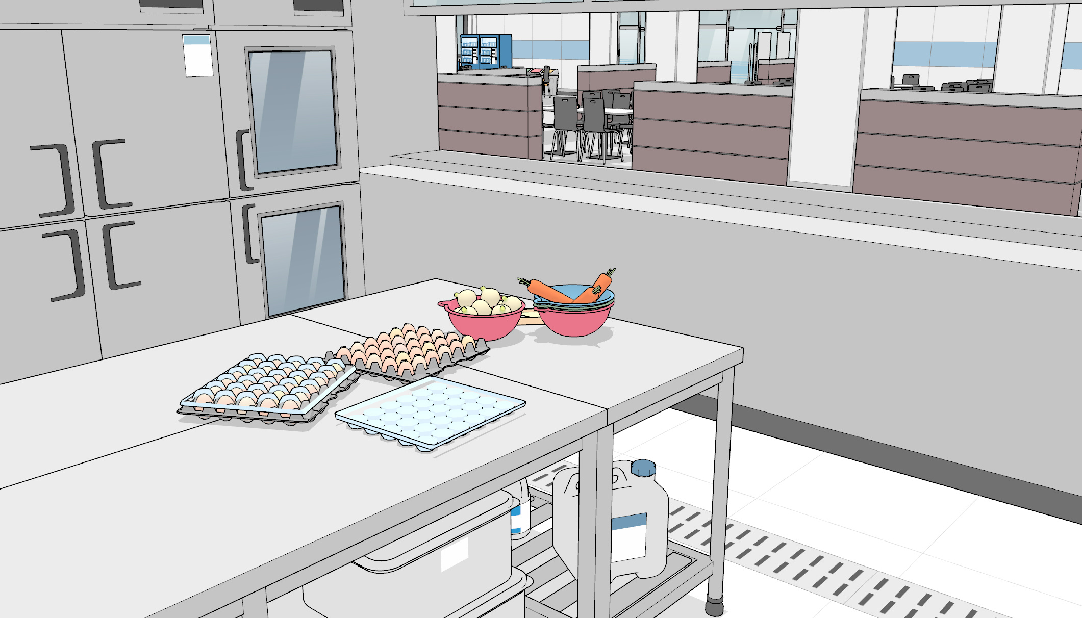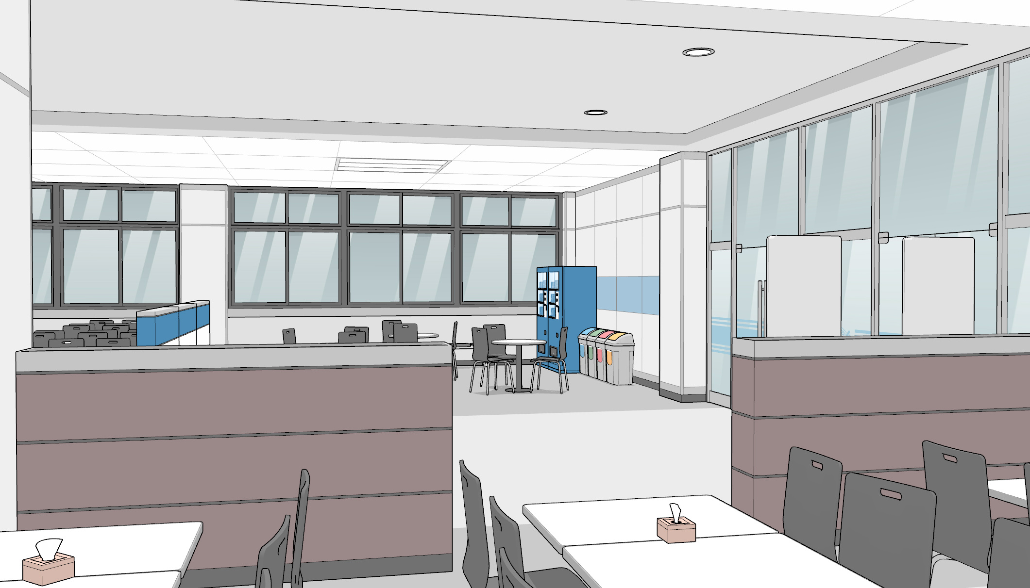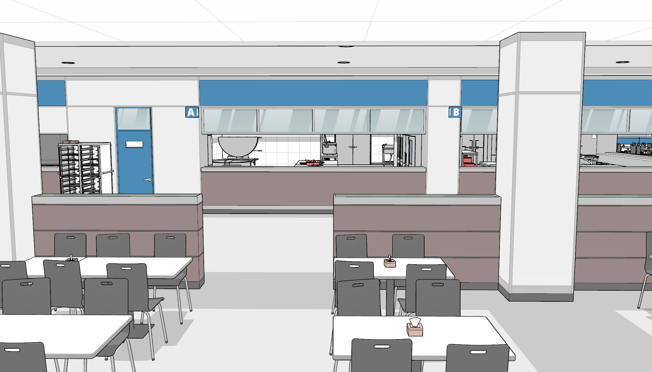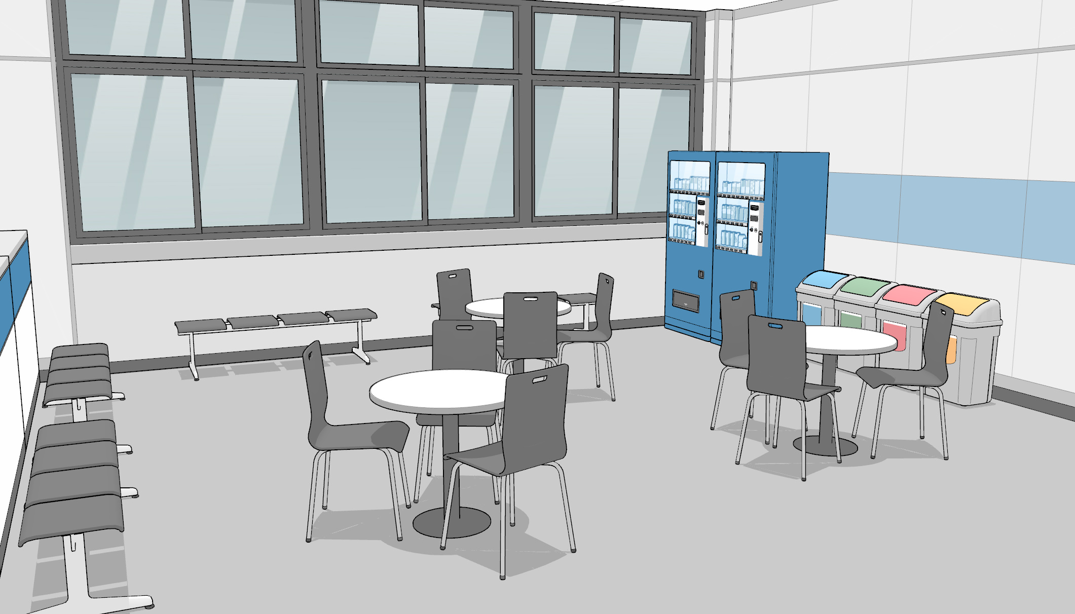 대학 학생식당을 기반으로 작업되긴 하였으나, 출입구쪽 유리창에 그려진 학교 로고만 바꿔주면 회사 구내식당으로 활용해도 손색이 없습니다.