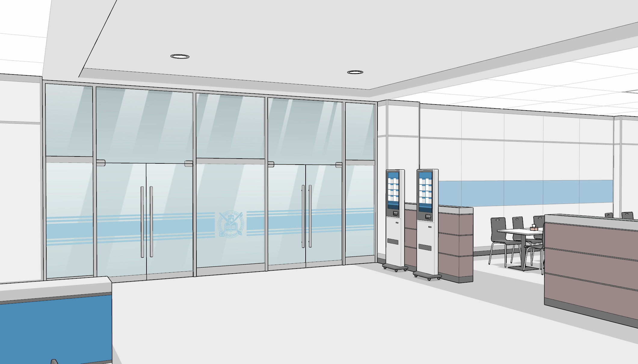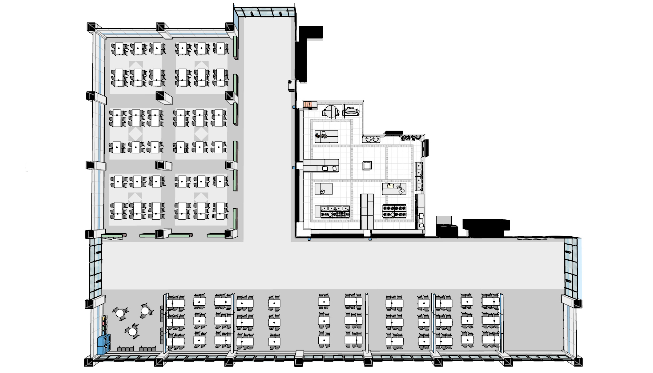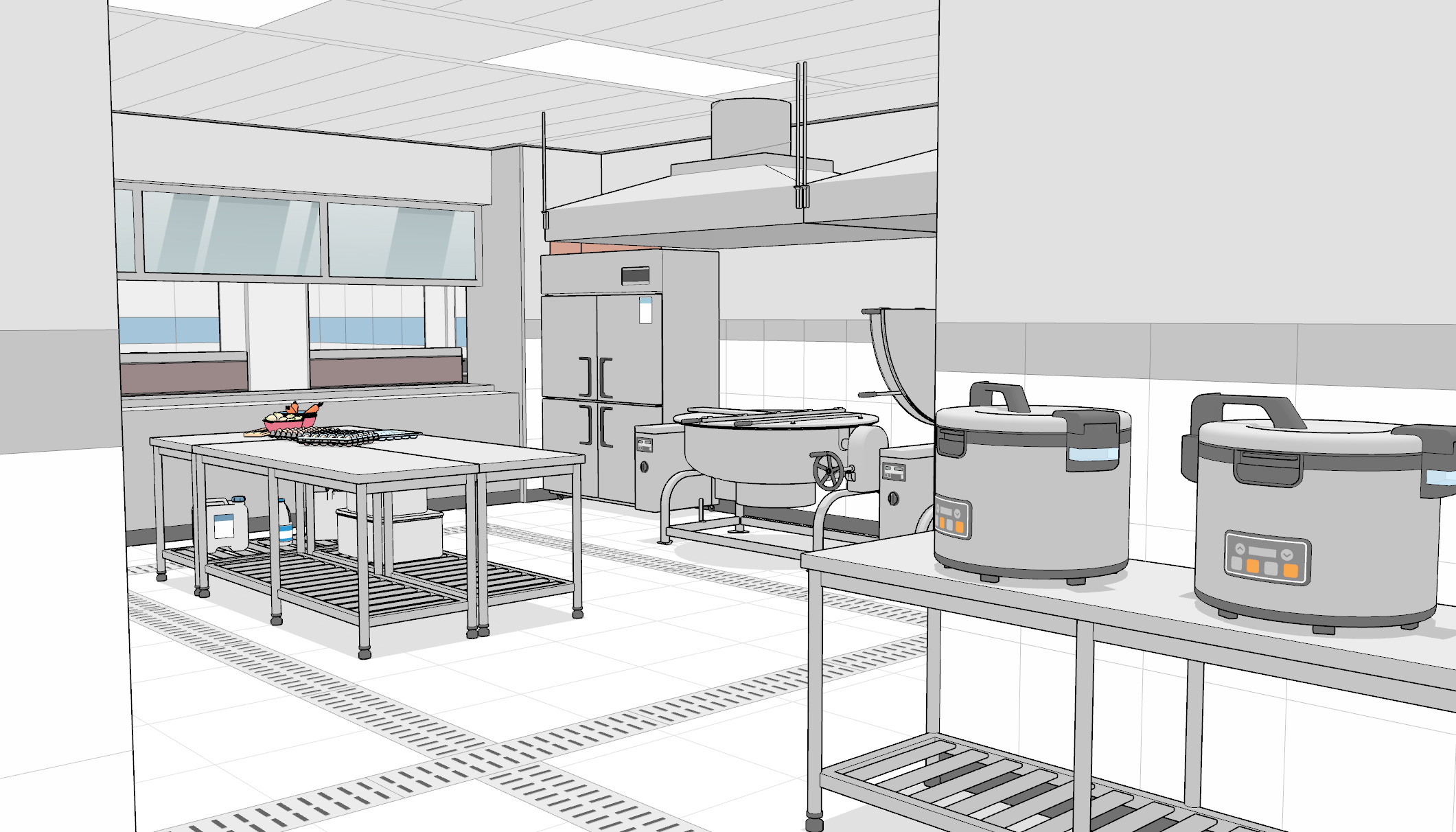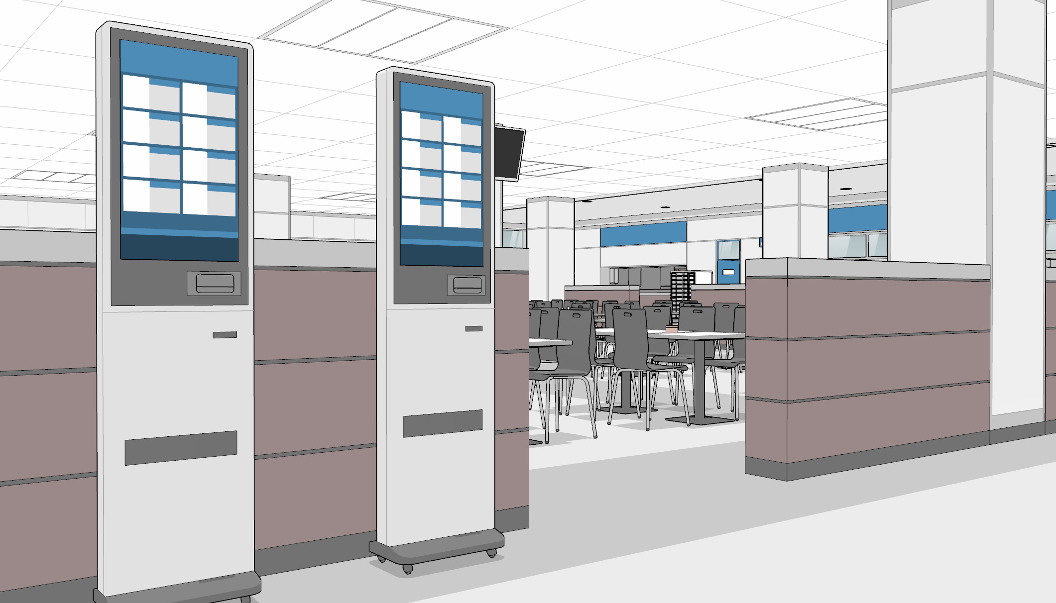 대학 학생식당을 기반으로 작업되긴 하였으나, 출입구쪽 유리창에 그려진 학교 로고만 바꿔주면 회사 구내식당으로 활용해도 손색이 없습니다.