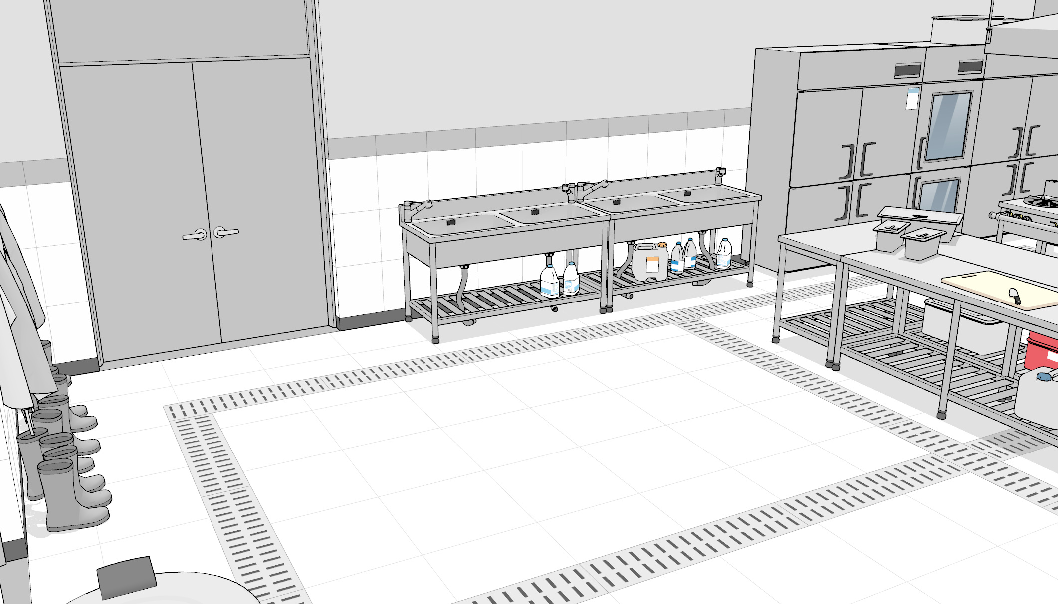 벽에는 앞치마와 장화가 나란히 정리되어있고, 주방 작업대 위에는 간단한 식재료가 손질을 위해 올라와있습니다.