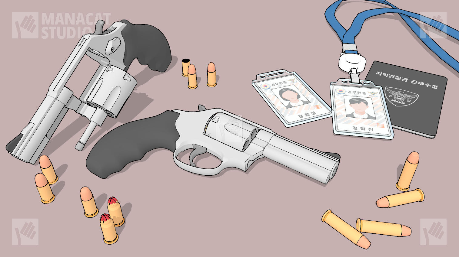 이중에서 경찰은 .38 스페셜탄(대문 이미지의 작은 탄입니다.)을 사용하고 있습니다.