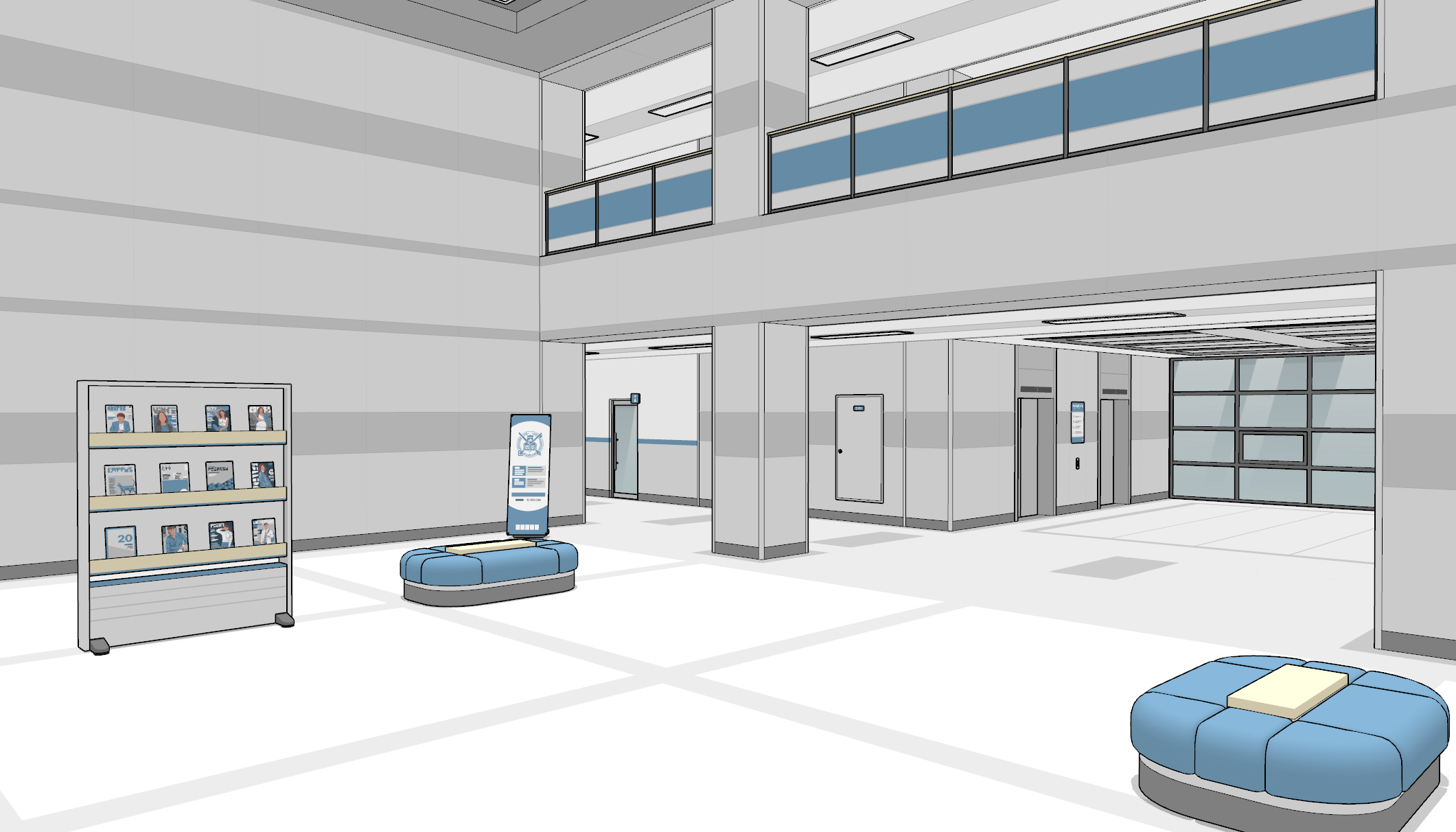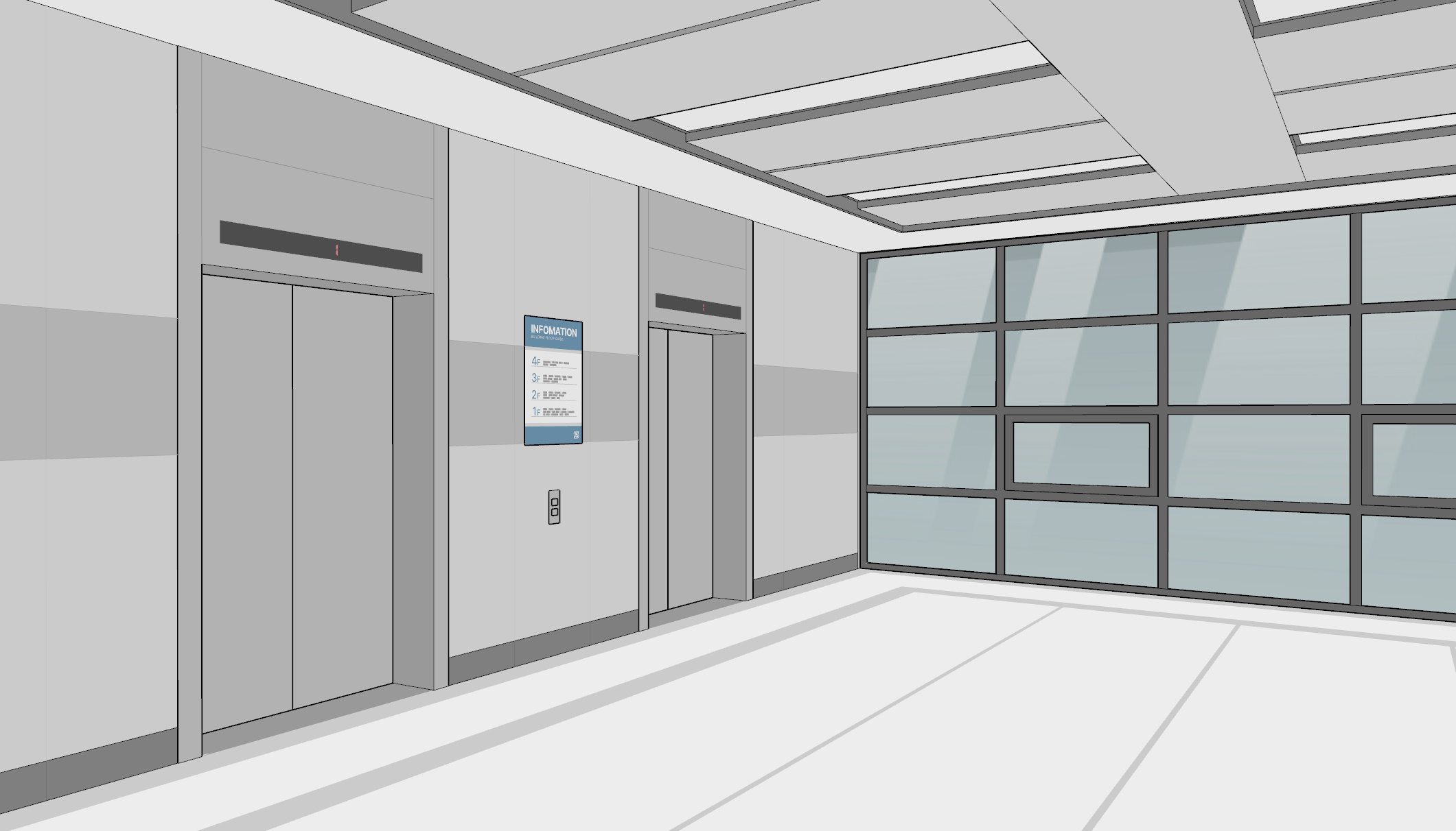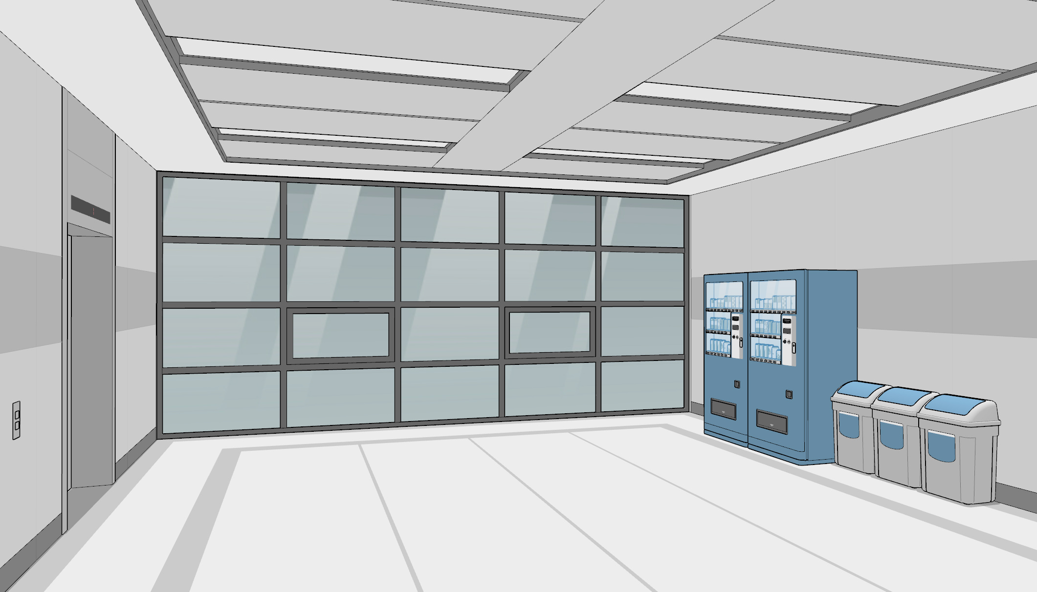 엘리베이터 로비입니다. 1층 로비에는 벤치가, 2층 로비에는 자판기와 쓰레기통이 배치되어 있습니다.