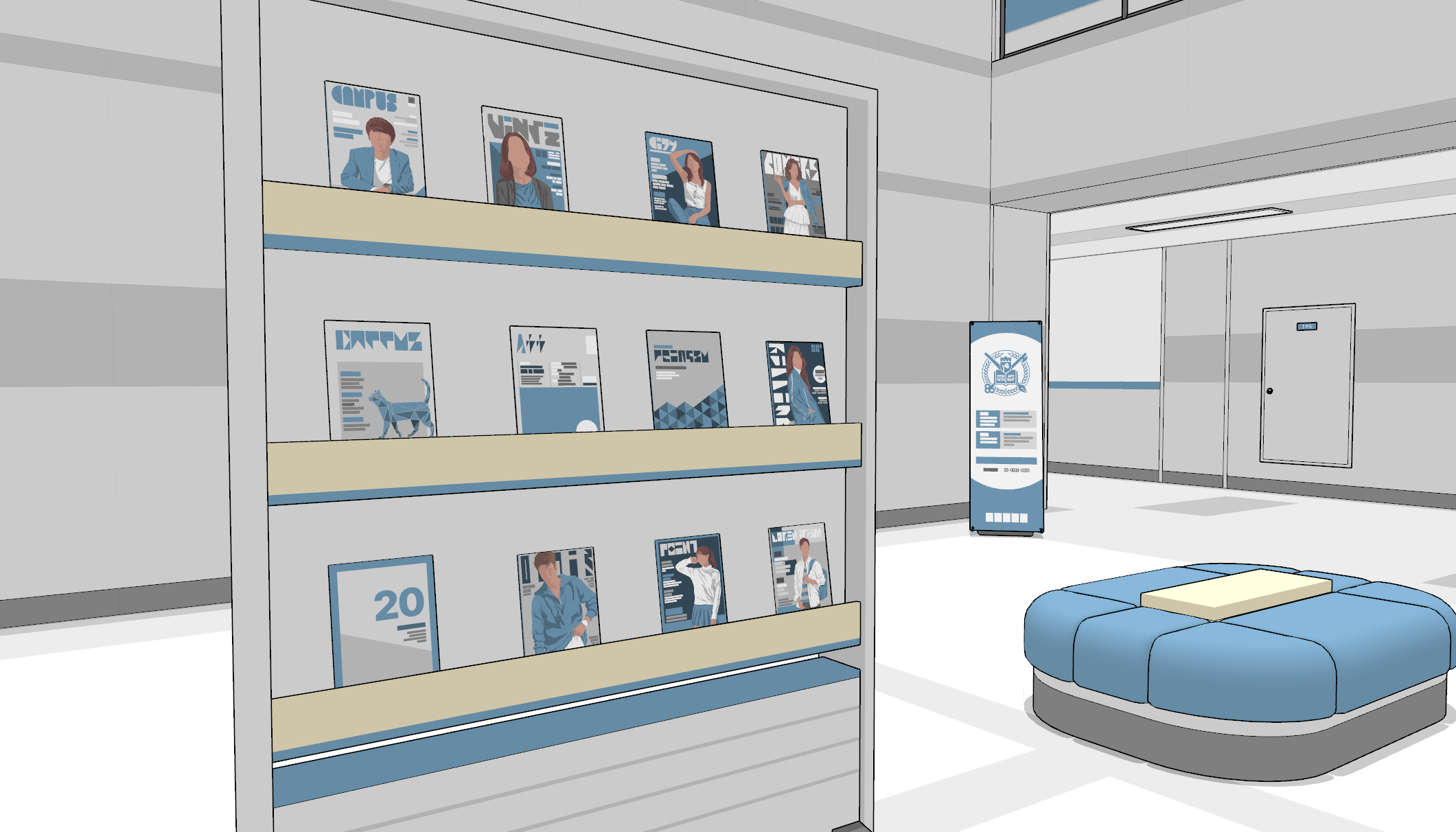대학잡지 서가입니다. 뒤로는 세워놓은 배너도 보입니다.