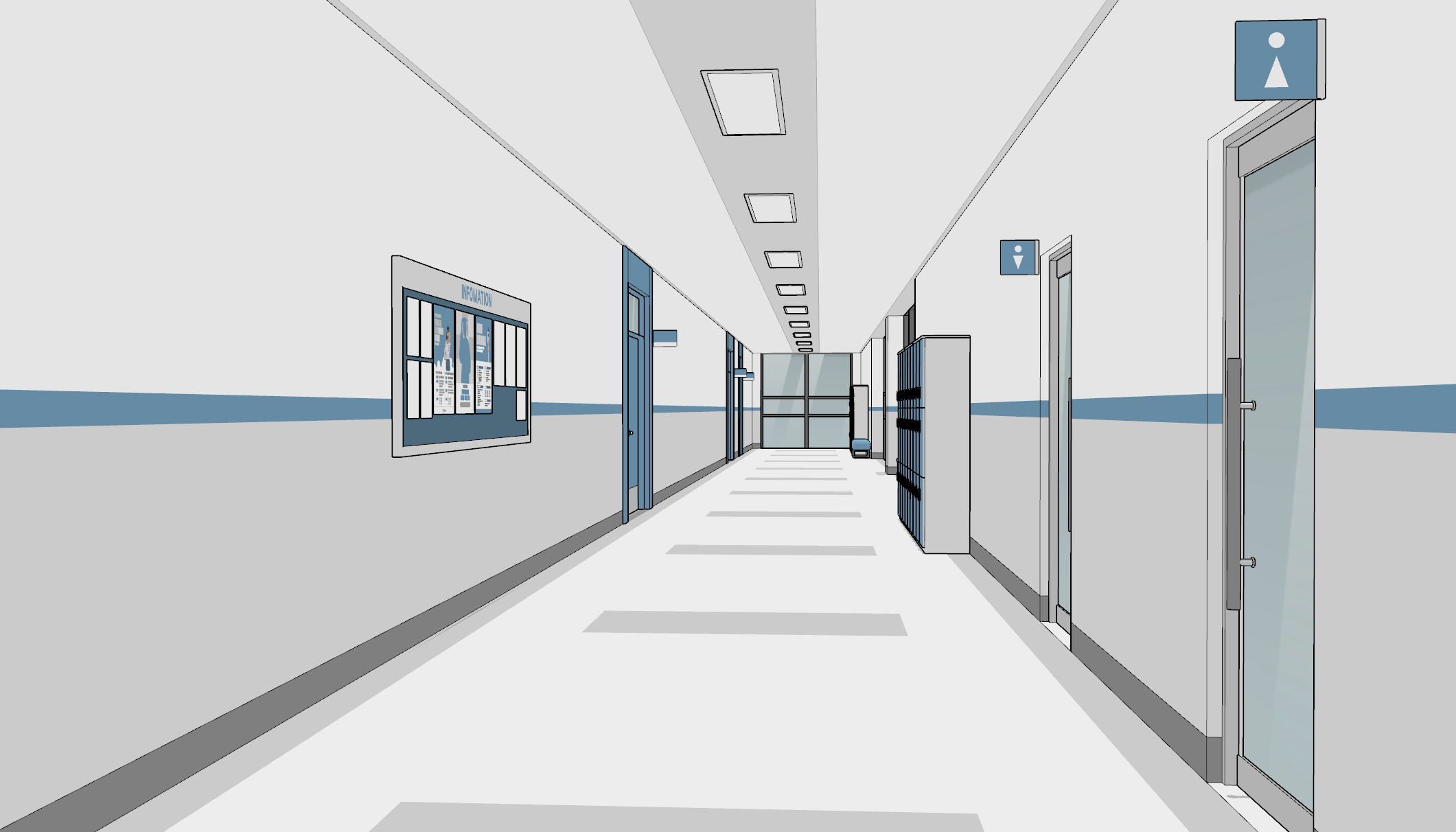 복도에는 게시판과 캐비닛, 벤치와 쓰레기통들이 곳곳에 배치되어 있습니다.